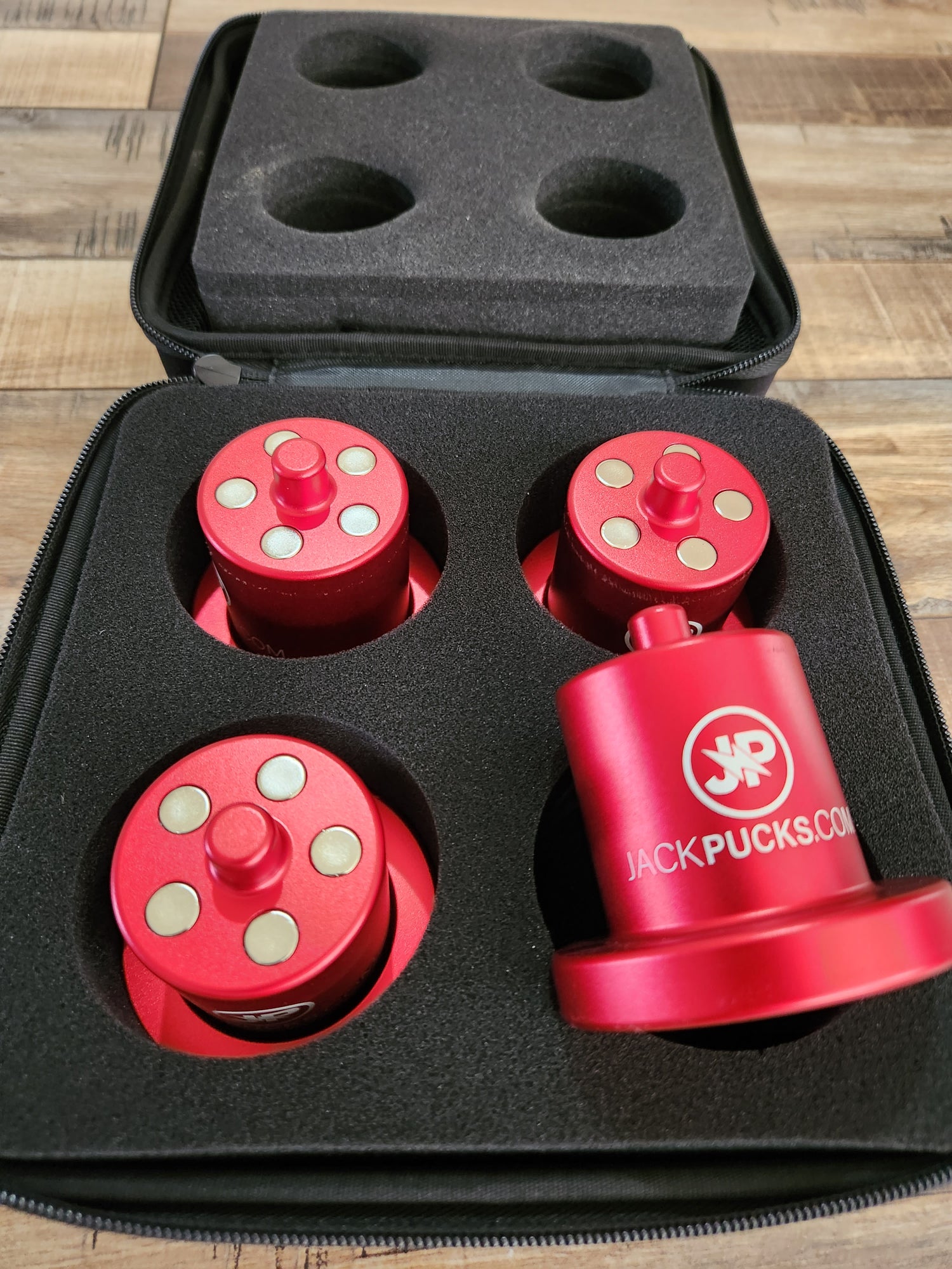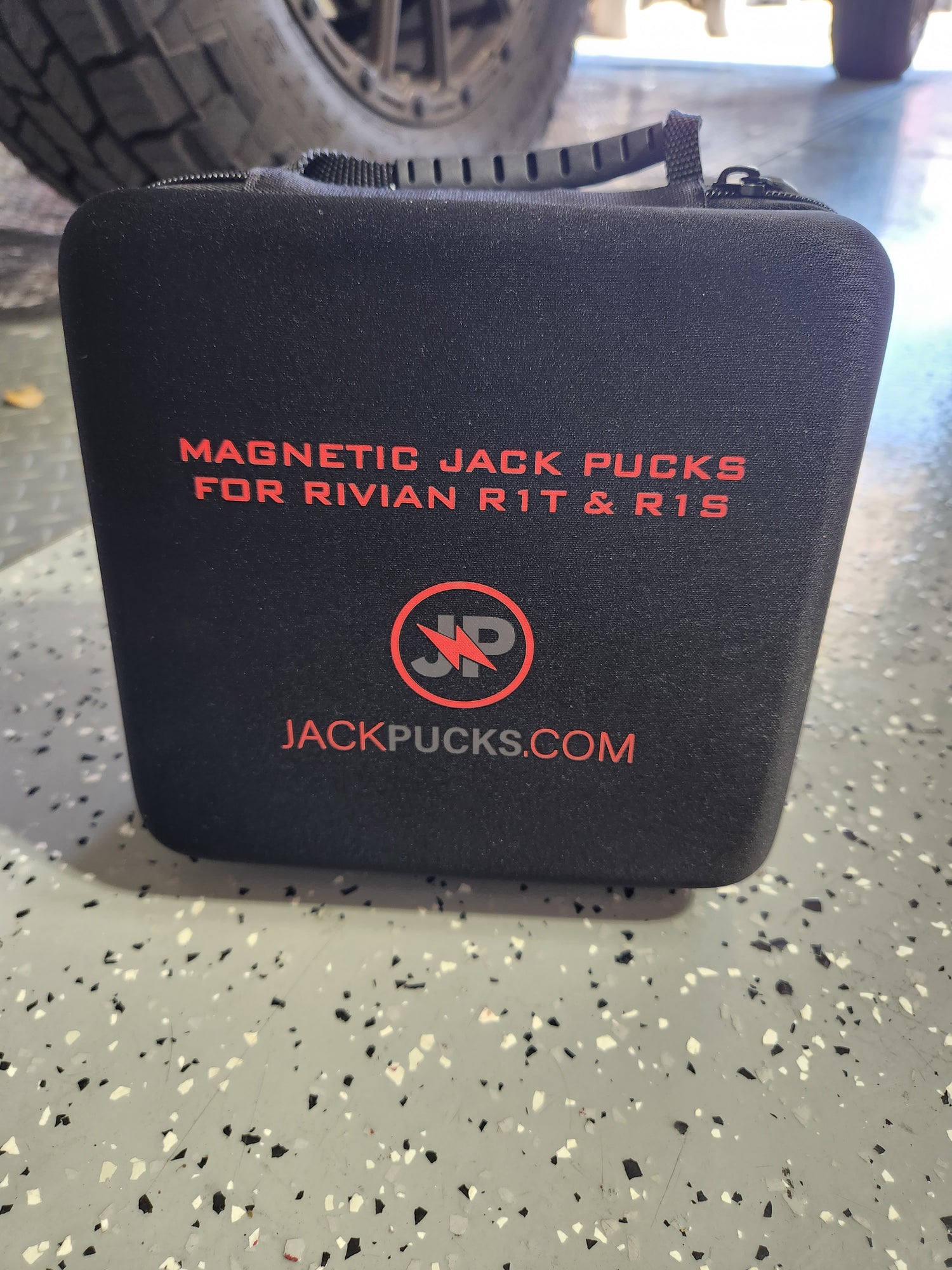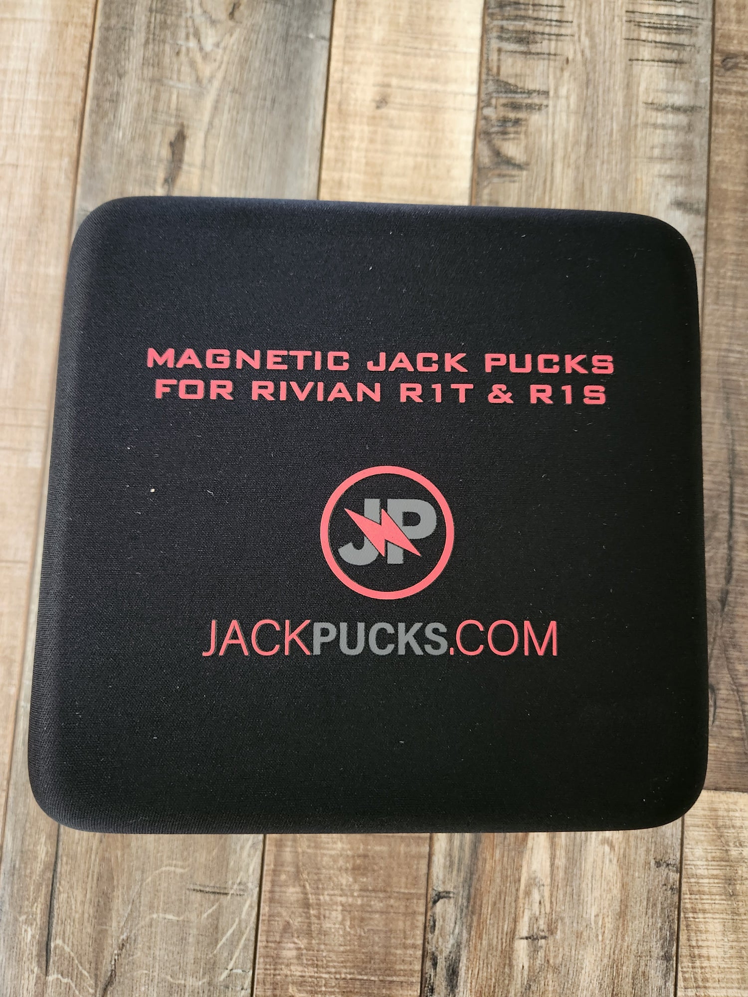 Our stunning and highly protected JP zippered case for our magnetic jack pucks is available for purchase. Great if you've upgraded from 1 or 2 pucks to a set of four. Robust design, has a storage pocket and bottom and top high density foam to protect your Magnetic Jack Pucks. Stores neatly in your Rivian.